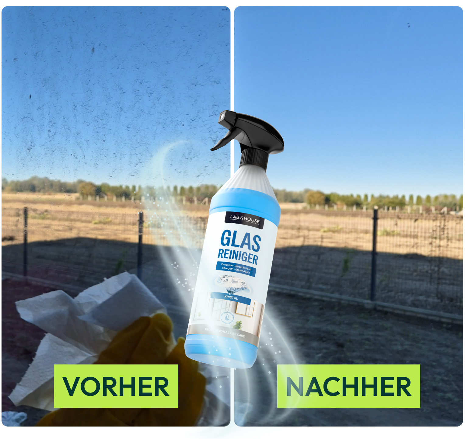 Fenster? Spiegel? Autoscheiben? Glastisch oder Geländer? Fettflecken? Dieser Reiniger reinigt alle Glasflächen. Ohne Streifen. Ohne Wasserflecken. Dafür mit Glanz und einem frischen Duft, der lange anhält.